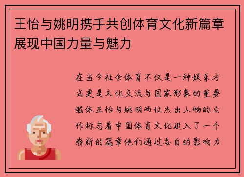 本文旨在深入探讨姚明的别名及其背后的文化象征意义。姚明,作为中国篮球的代表性人物,其别名不仅体现了个人特质,也反映了社会文化的多重层面。首先,文章将分析姚明别名的来源,包括历史背景与个人经历;其次,将探讨该别名对姚明职业生涯及社会影响力的作用;接着,讨论这一别名在不同文化语境中的象征意义;最后,将总结其对当代社会及新一代青年人的启示。通过这些视角,我们可以更全面地理解姚明所代表的价值和精神。 1...