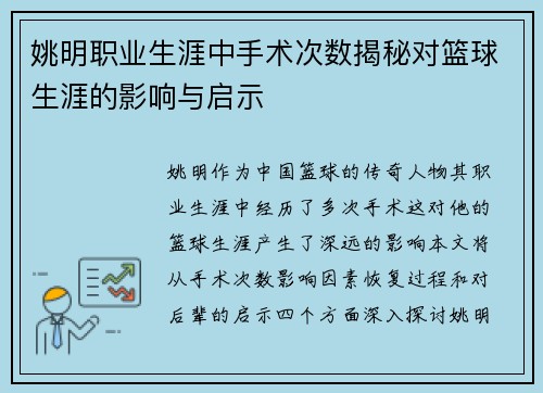 姚明,这位中国篮球的传奇巨星,不仅在球场上创造了辉煌的成就,还成功地转型为娱乐圈的一位风云人物。本文将从四个方面详细探讨姚明的华丽转身与人生哲学。首先,回顾他在NBA的辉煌生涯,分析其对中国篮球影响的重要性;接着,讨论他如何逐步融入娱乐圈,成为公众人物;然后,探讨他的慈善事业和社会责任感;最后,总结他的人生哲学,以及对于年轻一代的启示。通过这些方面,我们能够更全面地理解姚明这一独特的人物及其背后的...